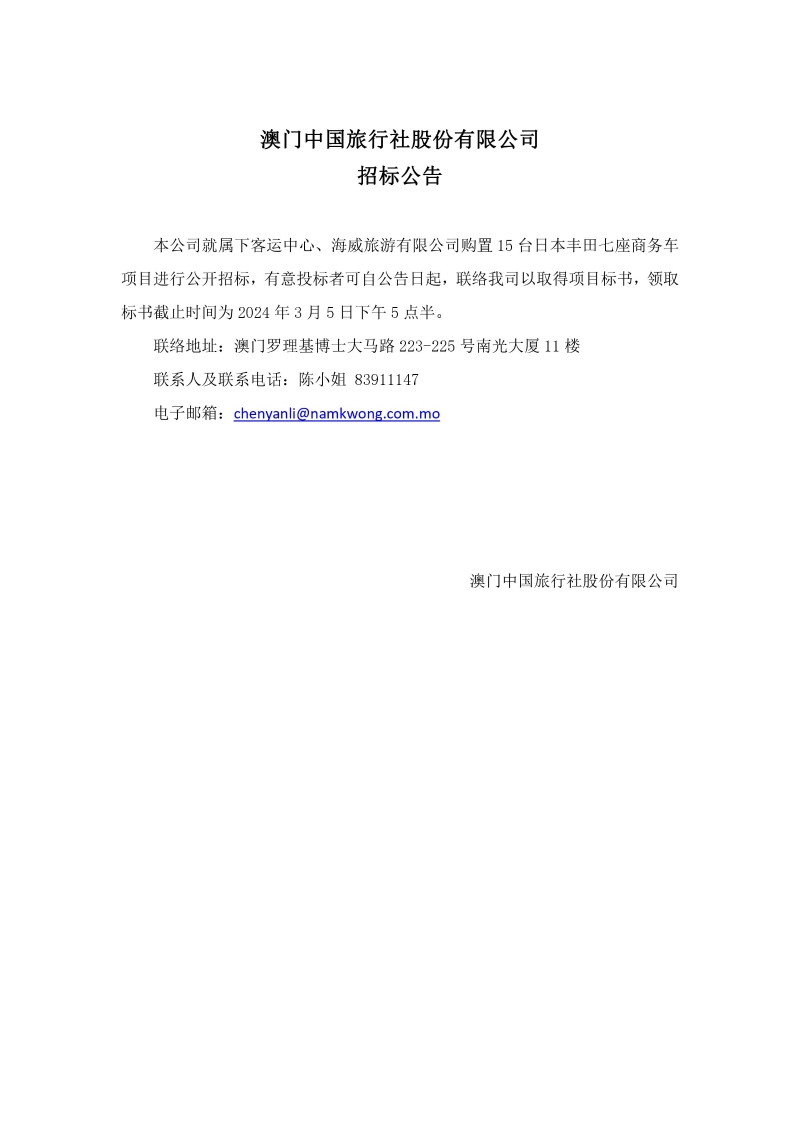澳中旅、海威旅游购置15台日本丰田七座商务车项目招标公告