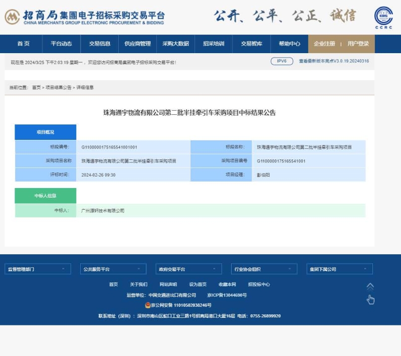 珠海通宇物流有限公司第二批半挂牵引车采购项目中标结果公告