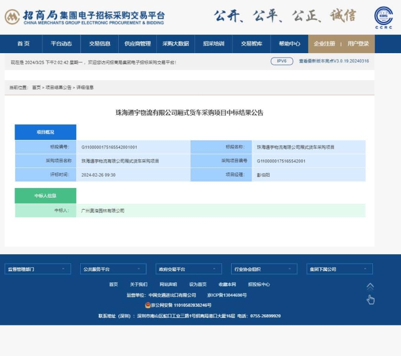 珠海通宇物流有限公司厢式货车采购项目中标结果公告