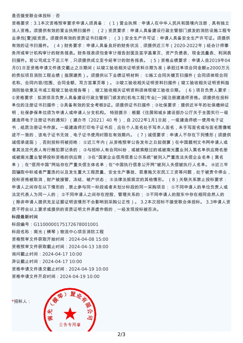 南光(横琴)物流中心项目消防工程资格预审公告