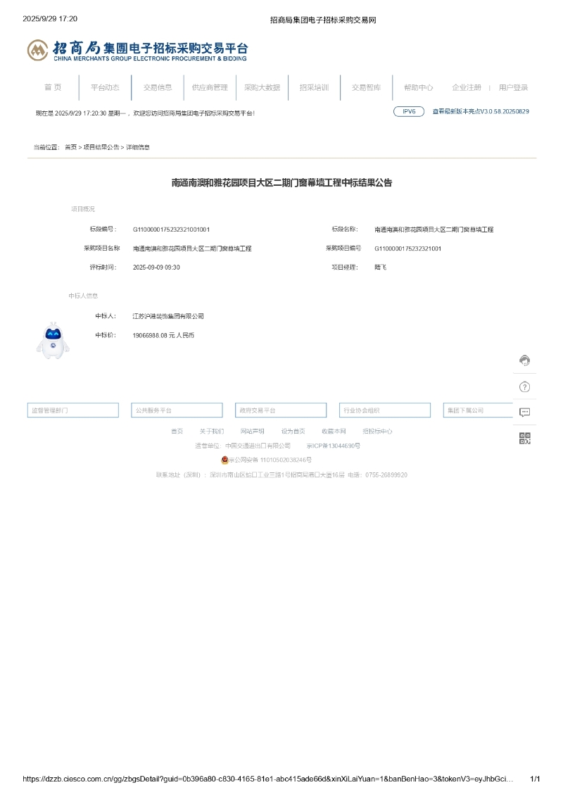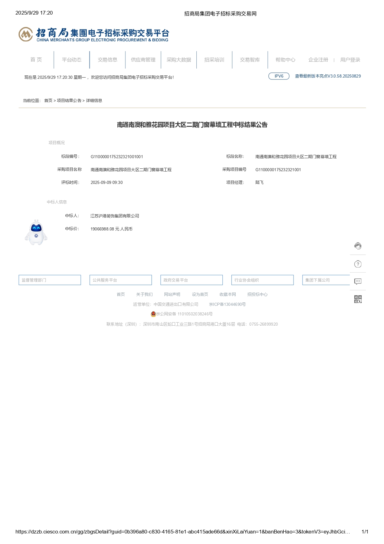 南通南澳和雅花园项目大区二期门窗幕墙工程中标结果公告
