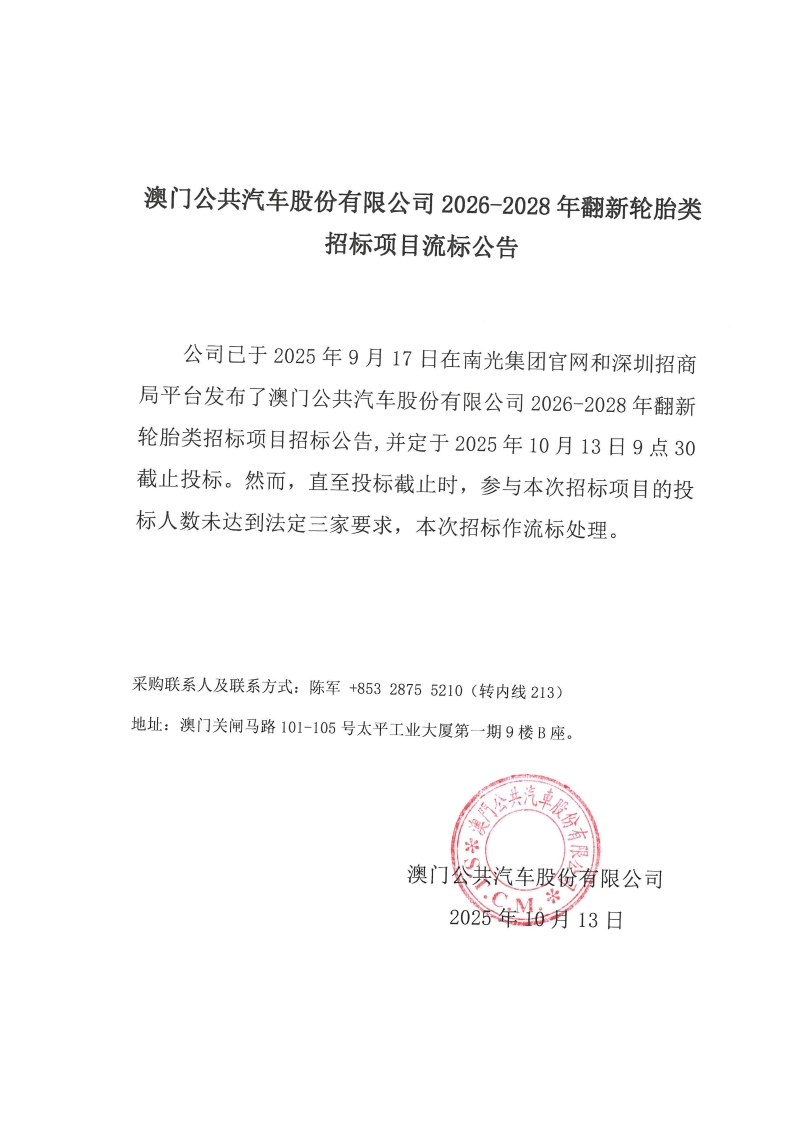 澳门公共汽车股份有限公司2026-2028年翻新轮胎类招标项目流标公告-盖章版.pdf