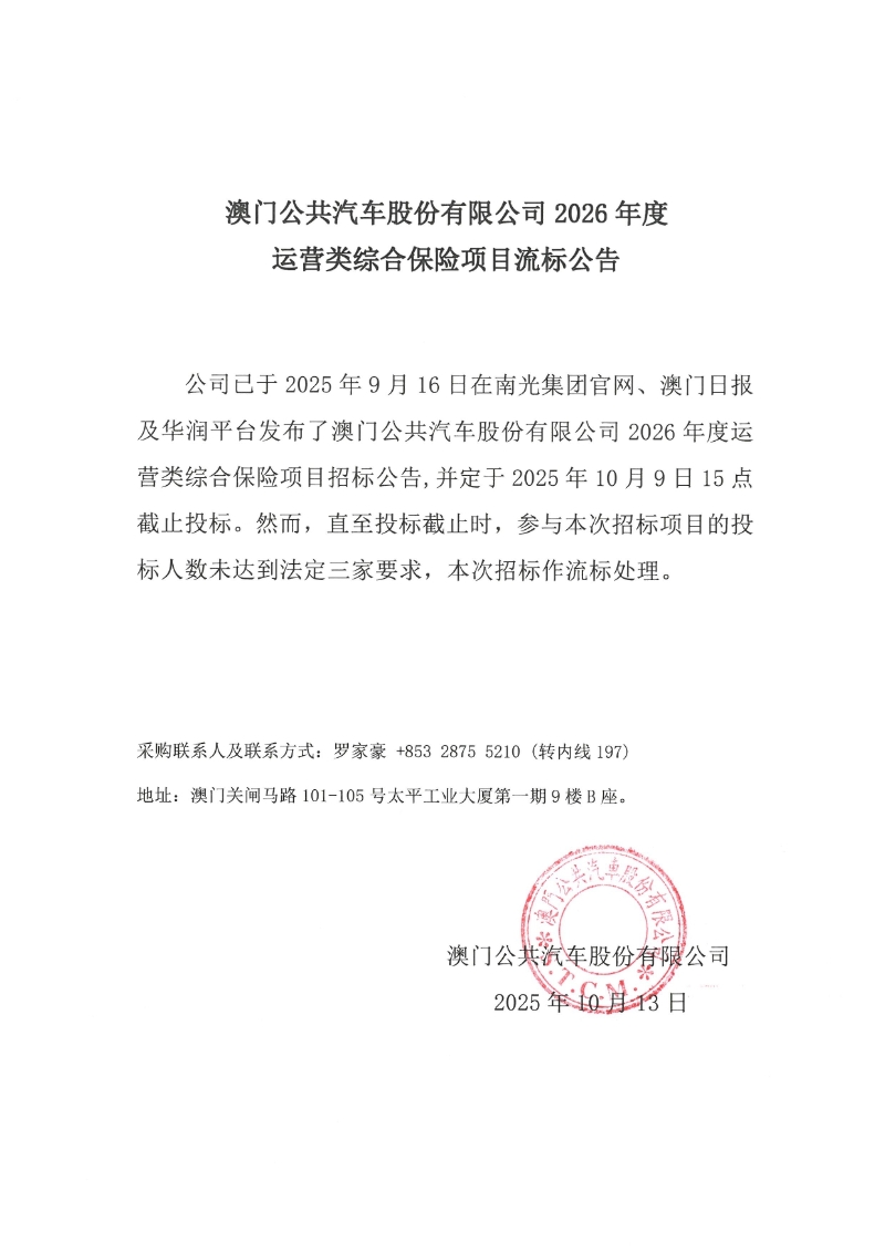 澳门公共汽车股份有限公司2026年度运营类综合保险项目流标公告
