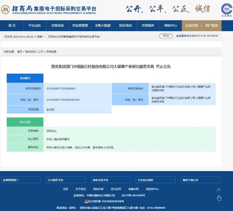 南光集团澳门中国旅行社股份有限公司大健康产业研究服务采购终止公告