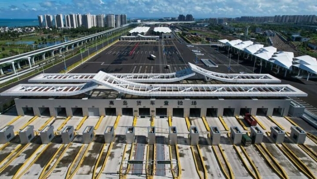 2025年9月17日,离岛货车通过海口新海港和南港“二线口岸”(货运)集中查验场,开往港区(无人机照片)。新华社记者 杨冠宇 摄
