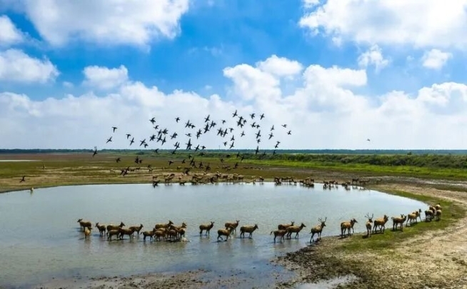 2025年10月11日,在江苏东台条子泥湿地,候鸟飞翔,成群野生麋鹿悠闲散步,一派人与自然和谐共生的生态美景(无人机照片)。新华社发(孙家录摄)