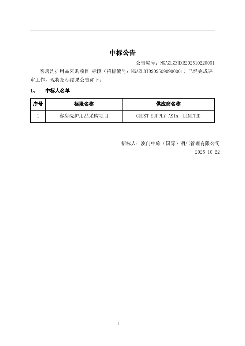 澳门中旅(国际)酒店管理有限公司客房洗护用品采购项目中标公告.pdf
