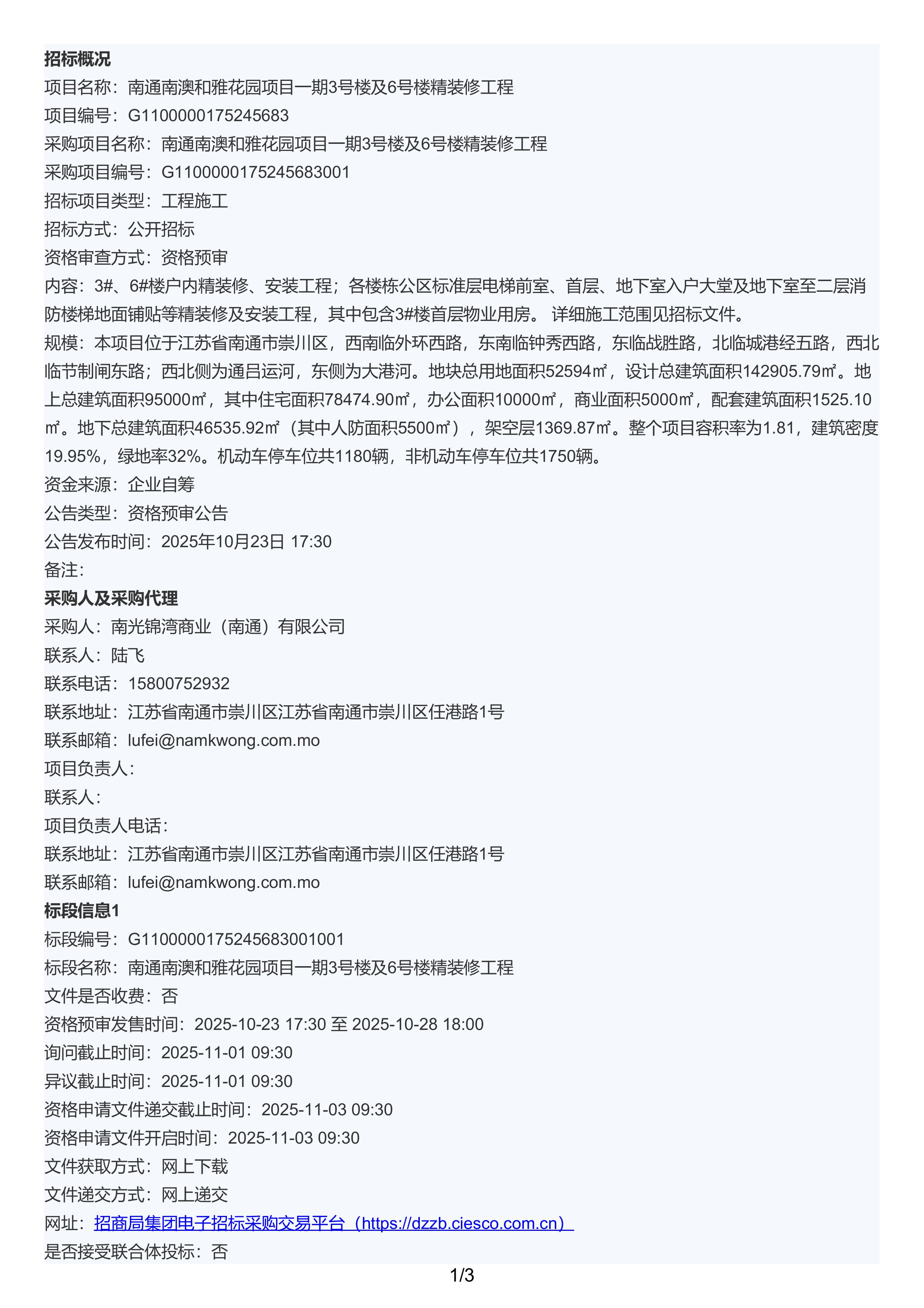 南通南澳和雅花园项目一期3号楼及6号楼精装修工程资格预审公告