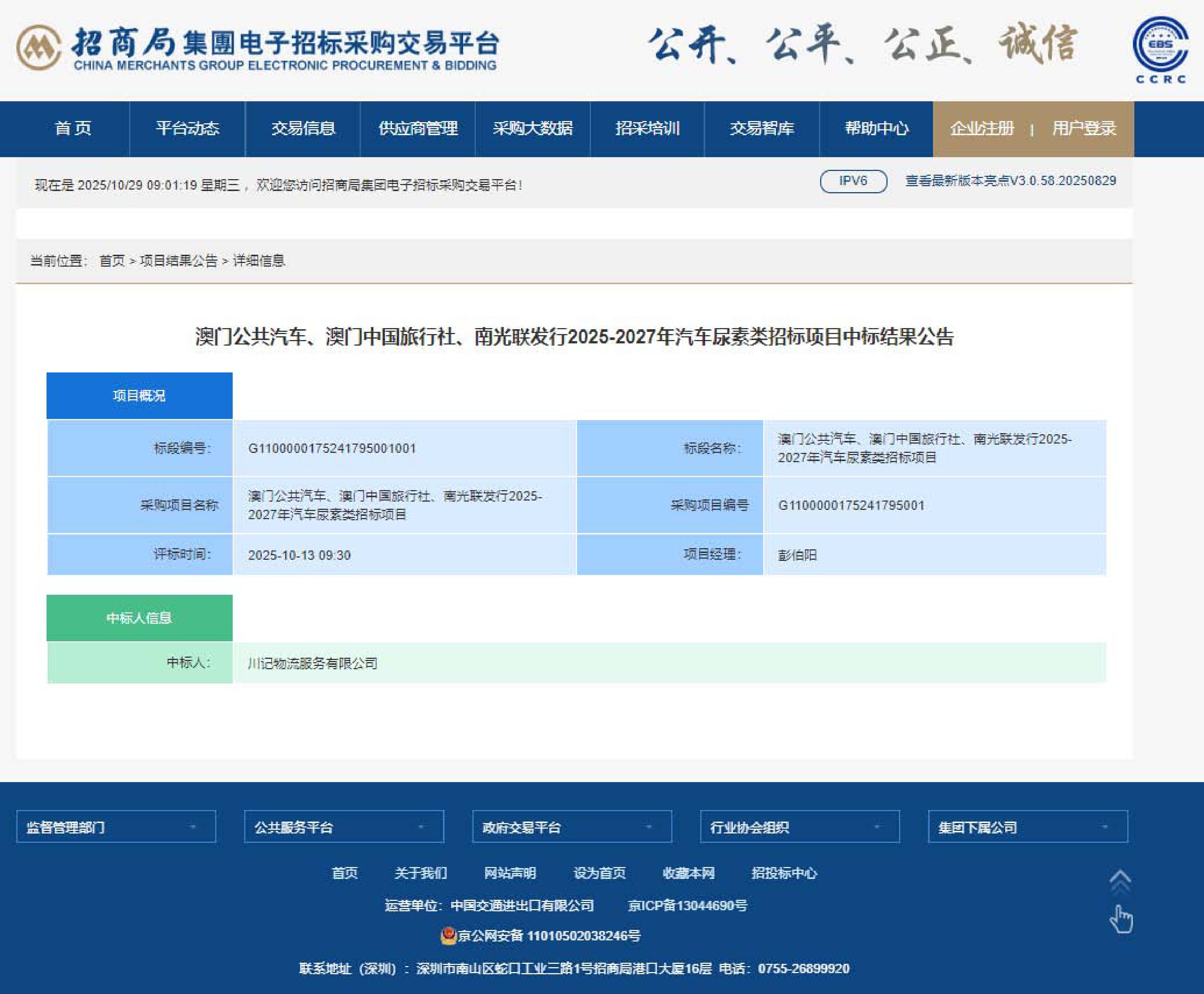澳门公共汽车、澳门中国旅行社、南光联发行2025-2027年汽车尿素类招标项目中标结果公告