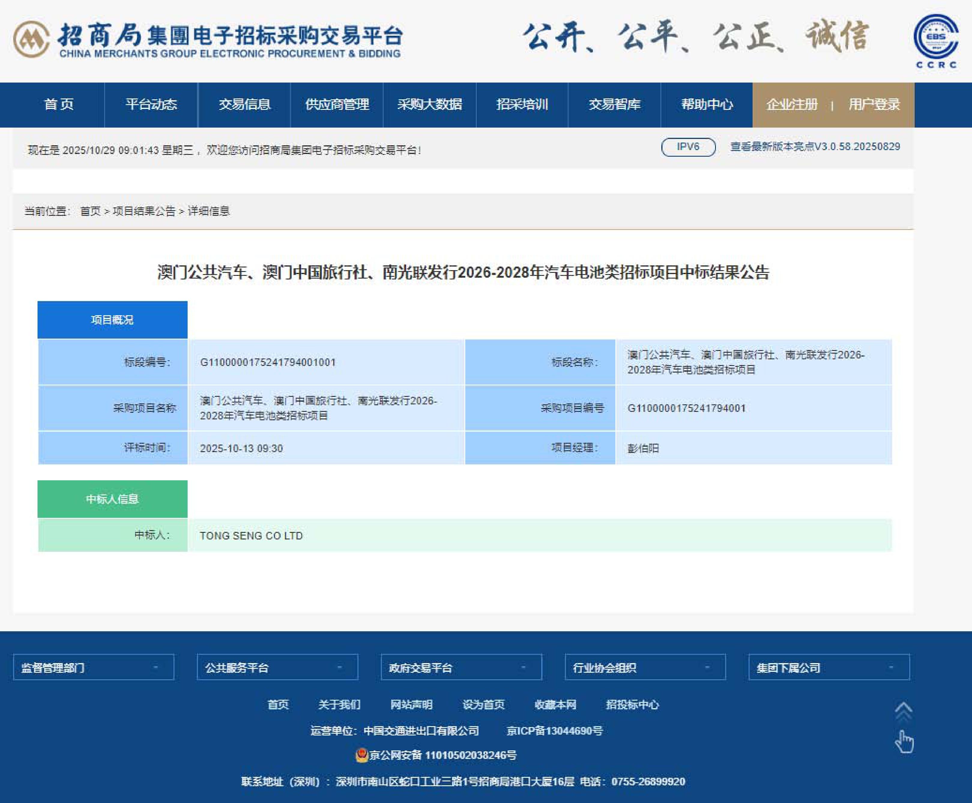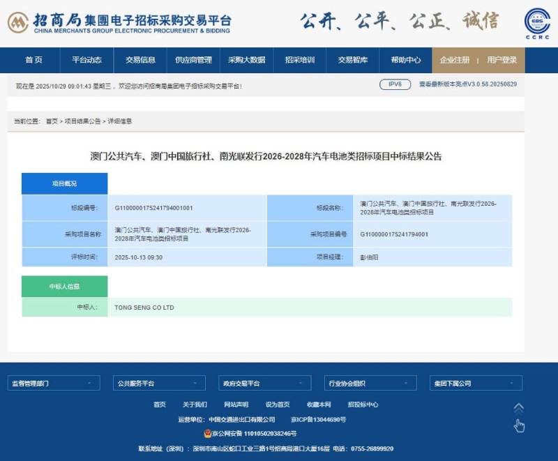 澳门公共汽车、澳门中国旅行社、南光联发行2026-2028年汽车电池类招标项目中标结果公告