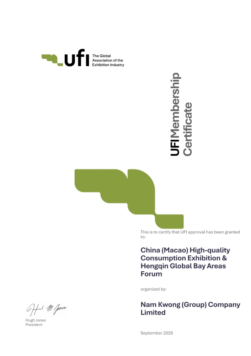 2025年9月,由集团联合商务部外贸发展局、广东省商务厅共同主办的中国(澳门)国际高品质消费博览会暨横琴世界湾区论坛(以下简称“高品会”),正式通过国际展览业协会(UFI)认证。这是澳门第12个获此认证的展会,也是琴澳“一会展两地”模式下首个获该国际权威认证的展会品牌,标志着高品会国际影响力进一步提升。