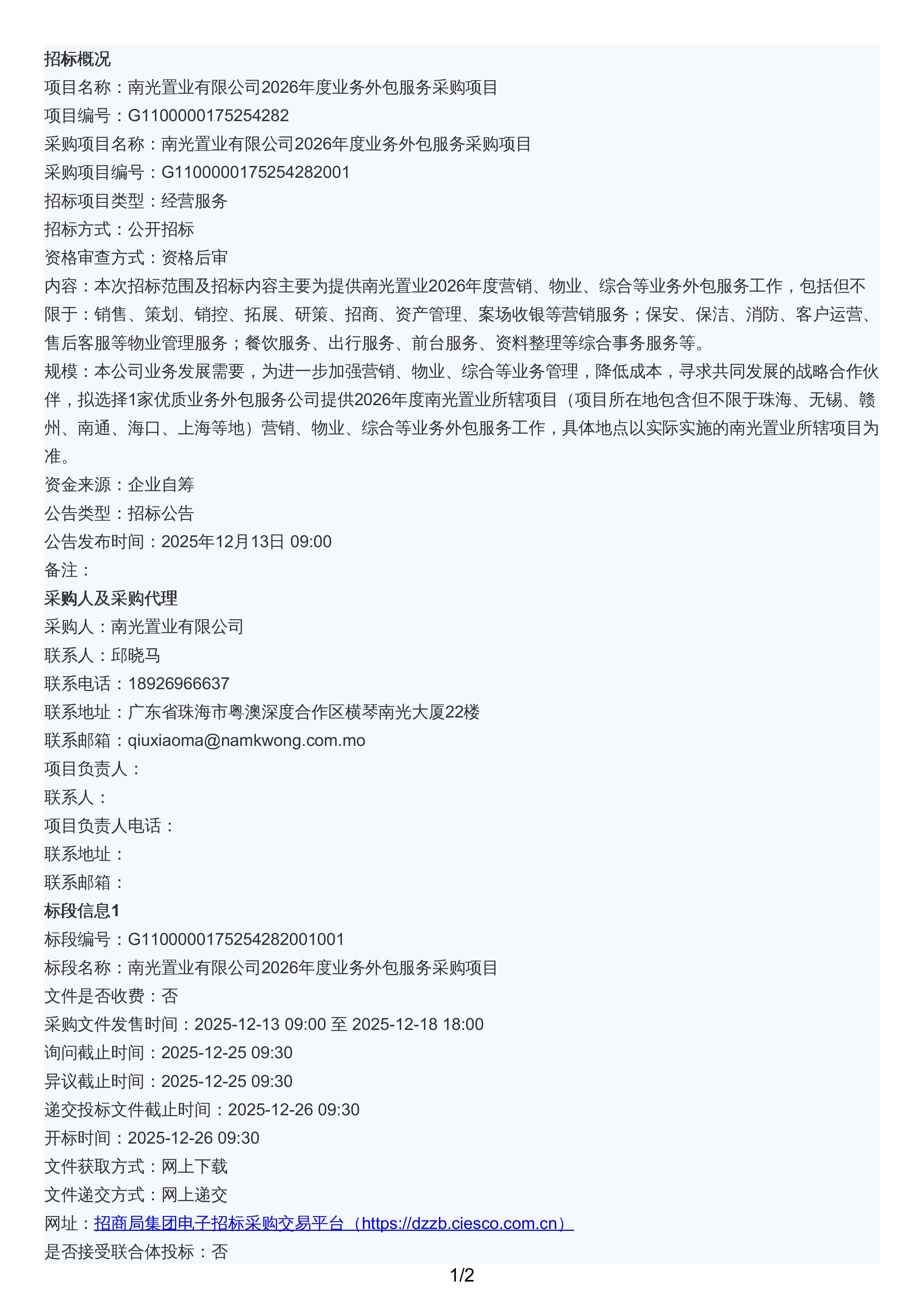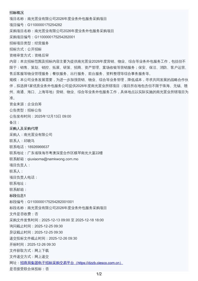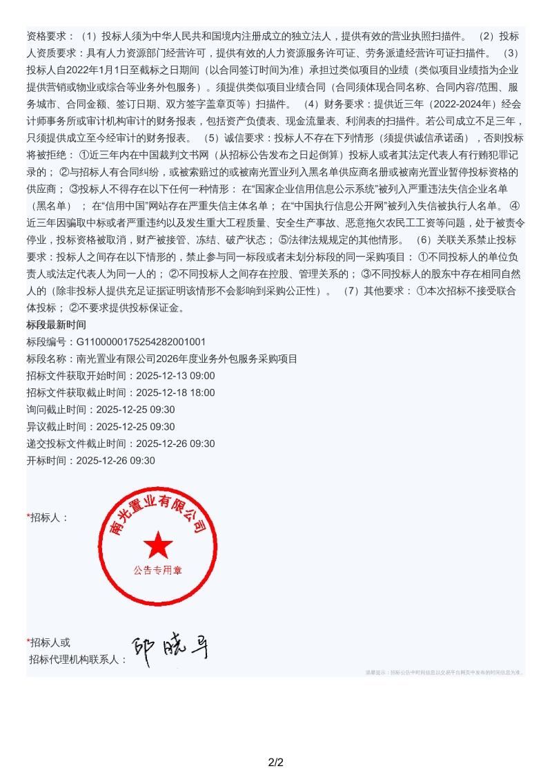 南光置业有限公司2026年度业务外包服务采购项目招标公告.pdf