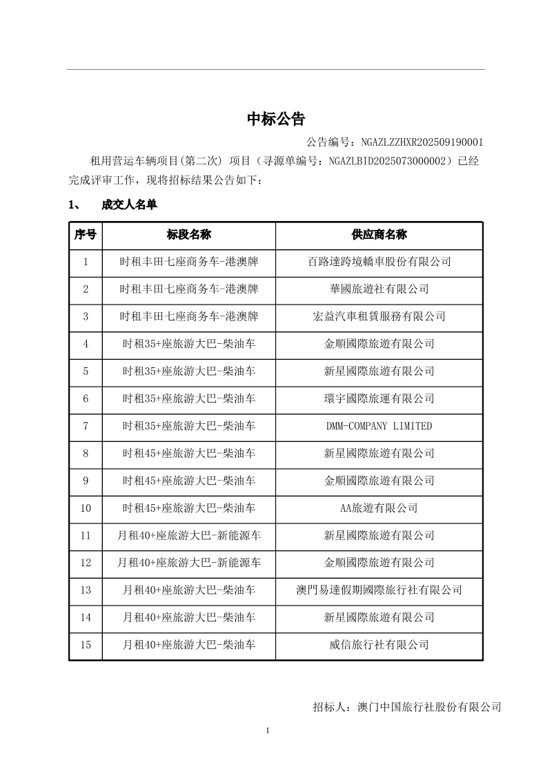 澳门中国旅行社股份有限公司租用营运车辆项目(第二次)中标公告.pdf