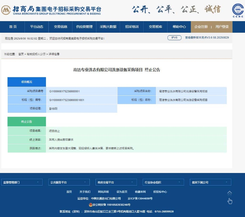 高洁专业洗衣有限公司洗涤设备采购项目终止公告