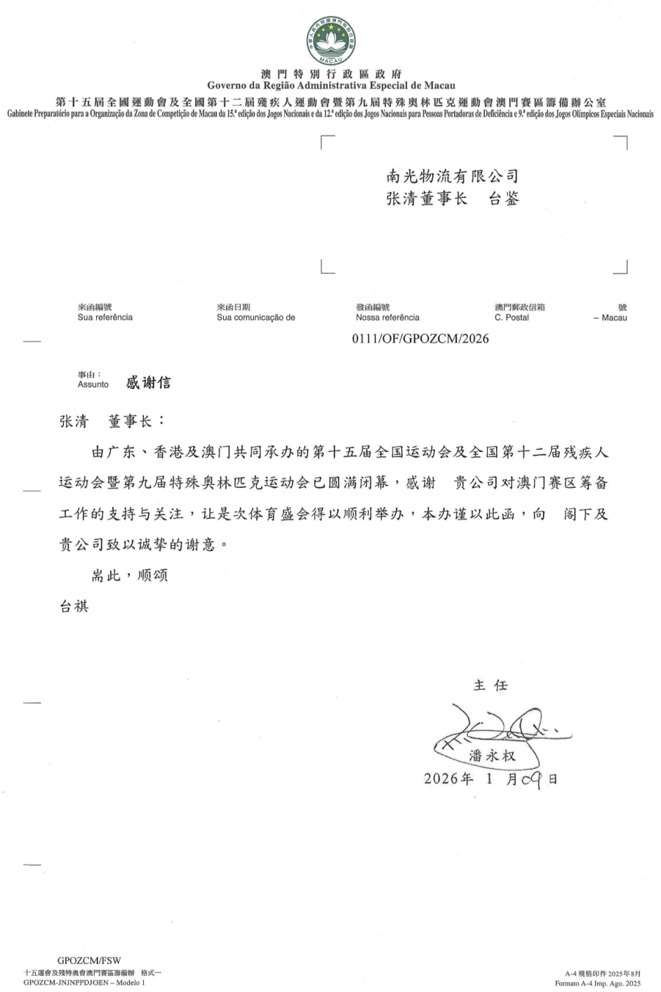 1月9日,南光物流收到十五运会及残特澳会澳门赛区筹备办公室发来的感谢信,对公司全力支持澳门赛区筹备工作、保障此次体育盛会圆满举办表示认可与感谢。