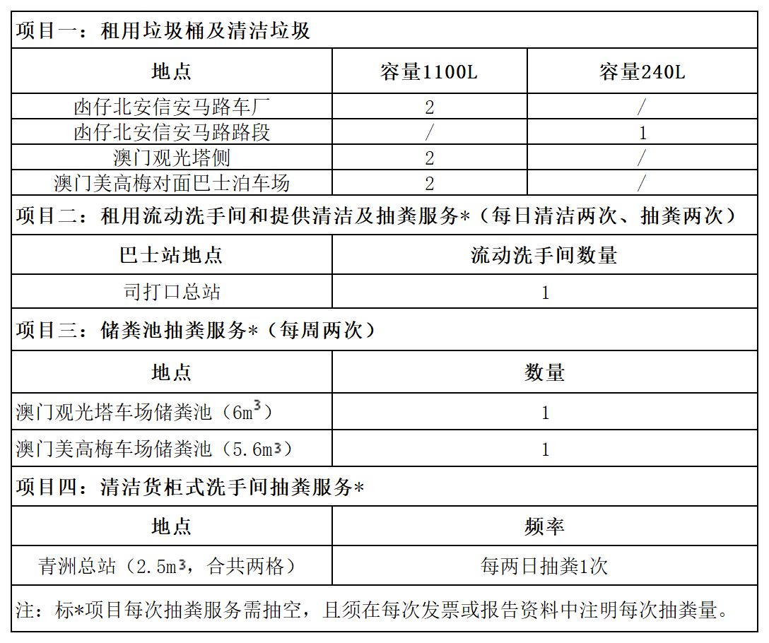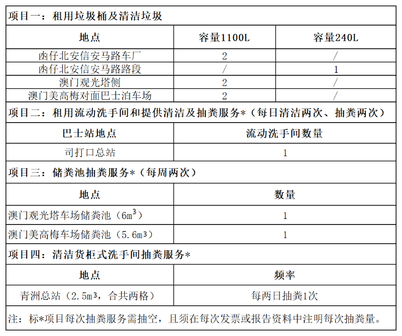 1.为澳门公共汽车股份有限公司2026-2028年提供清洁服务,本次采购为单价采购,实际服务项目、地点和内容可因应使用方之实际情况作出增减。最终结算以招标方实际采购量为准。
