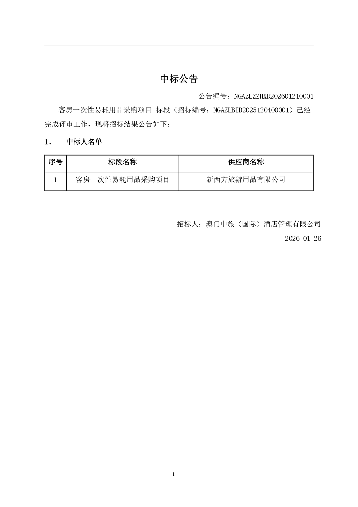 澳门中旅(国际)酒店管理有限公司客房一次性易耗用品采购项目招标结果公告.pdf