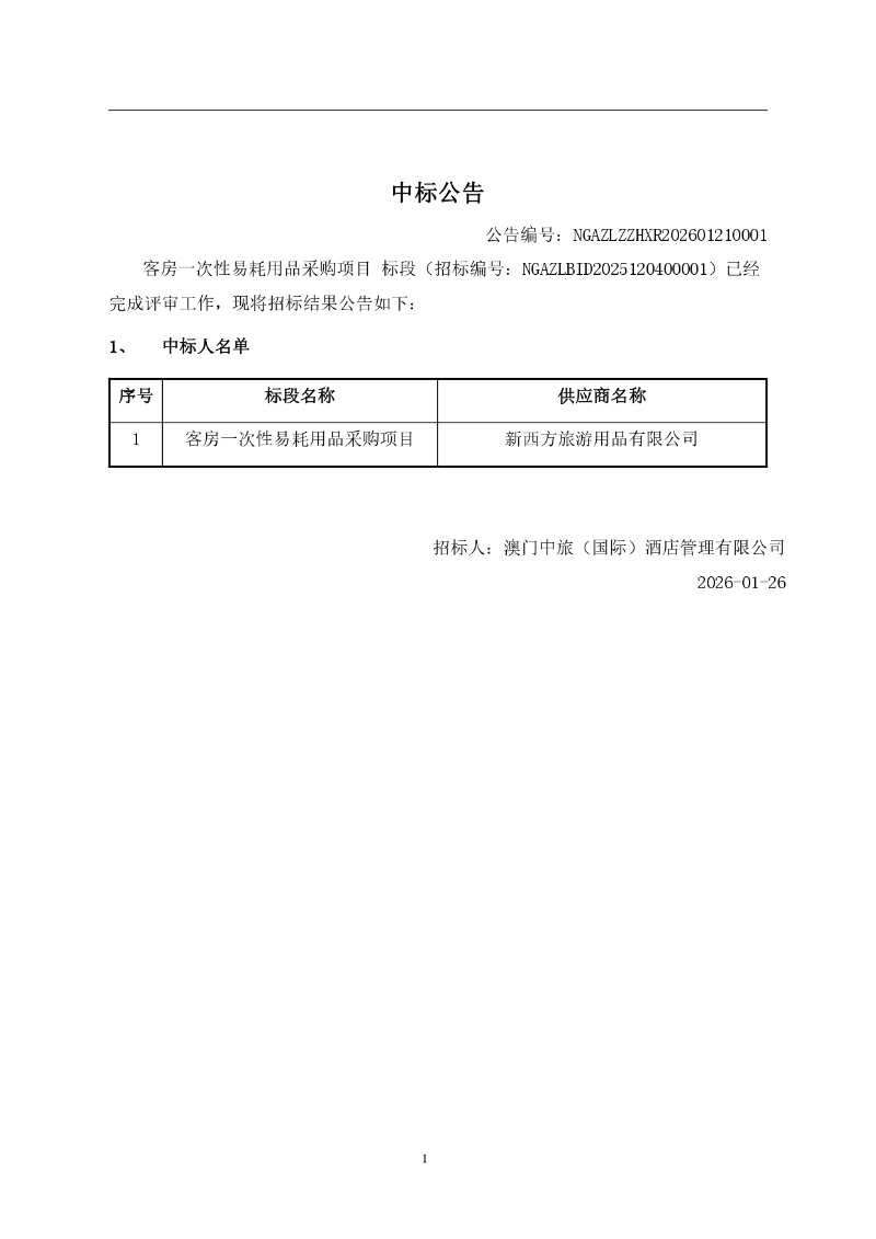 澳门中旅(国际)酒店管理有限公司客房一次性易耗用品采购项目招标结果公告