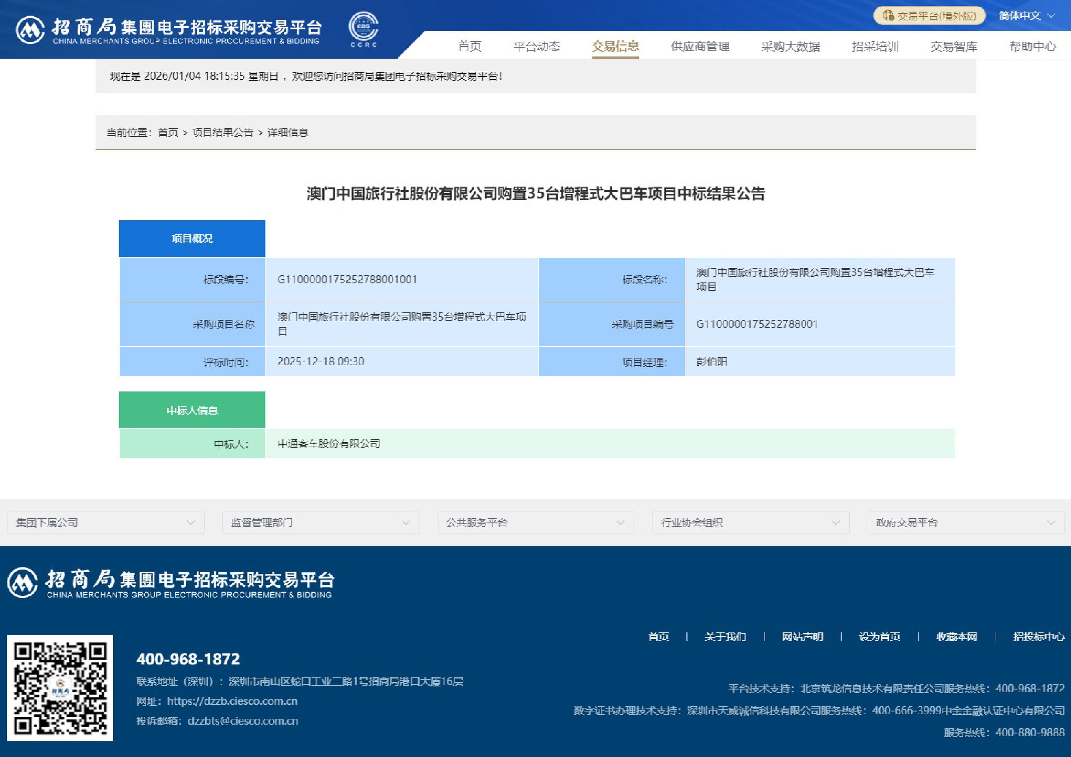 澳门中国旅行社股份有限公司购置35台增程式大巴车项目中标结果公告