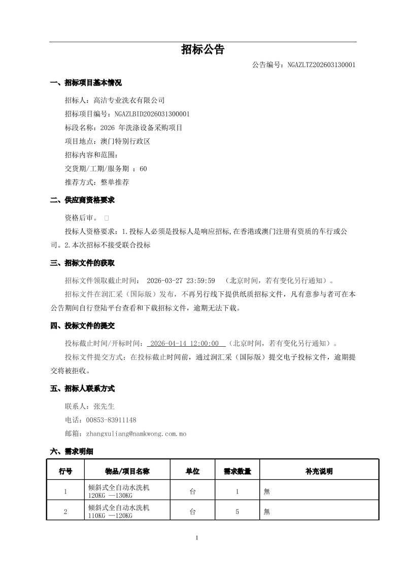 高洁专业洗衣有限公司2026年洗涤设备采购项目公告.pdf