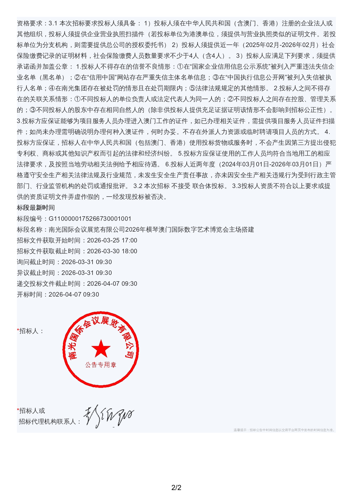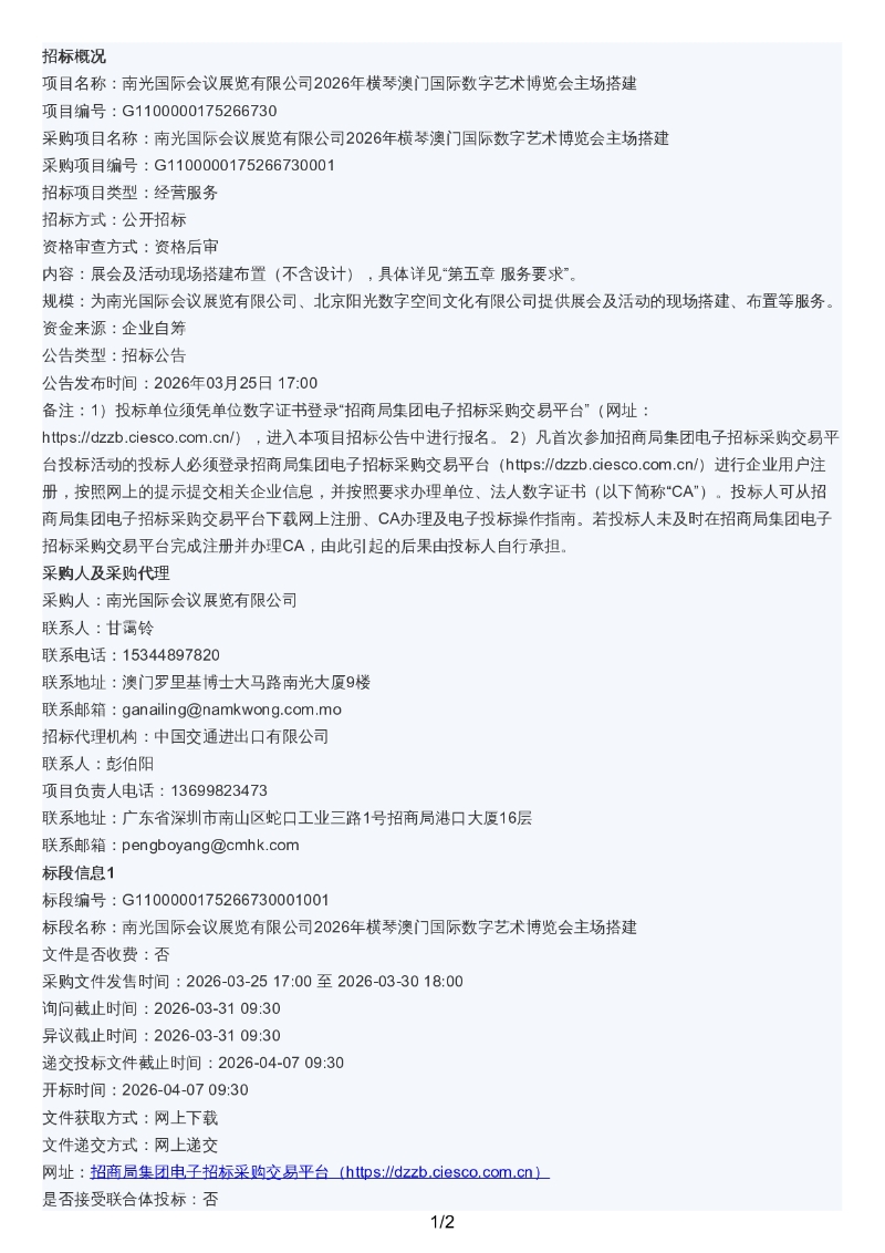 南光国际会议展览有限公司2026年横琴澳门国际数字艺术博览会主场搭建招标公告(1).pdf