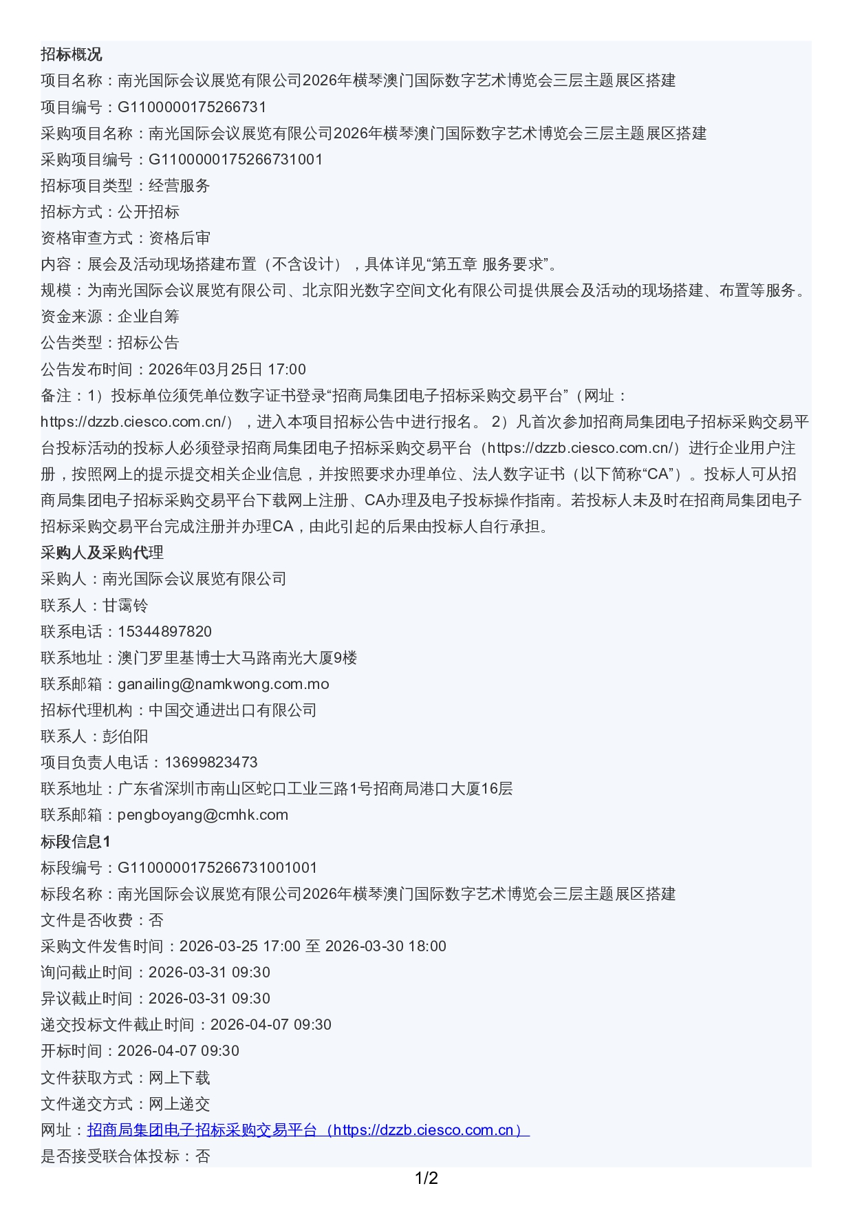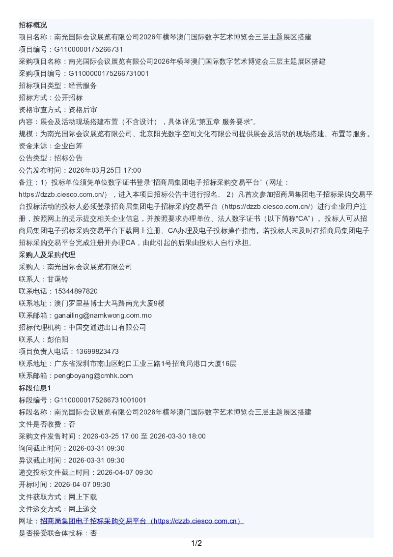 南光国际会议展览有限公司2026年横琴澳门国际数字艺术博览会三层主题展区搭建招标公告(1).pdf