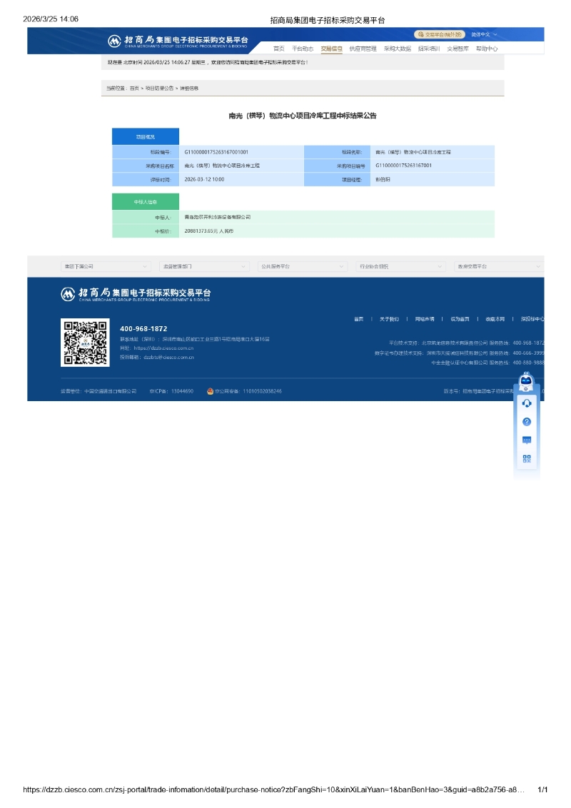 南光(横琴)物流中心项目冷库工程中标结果公告
