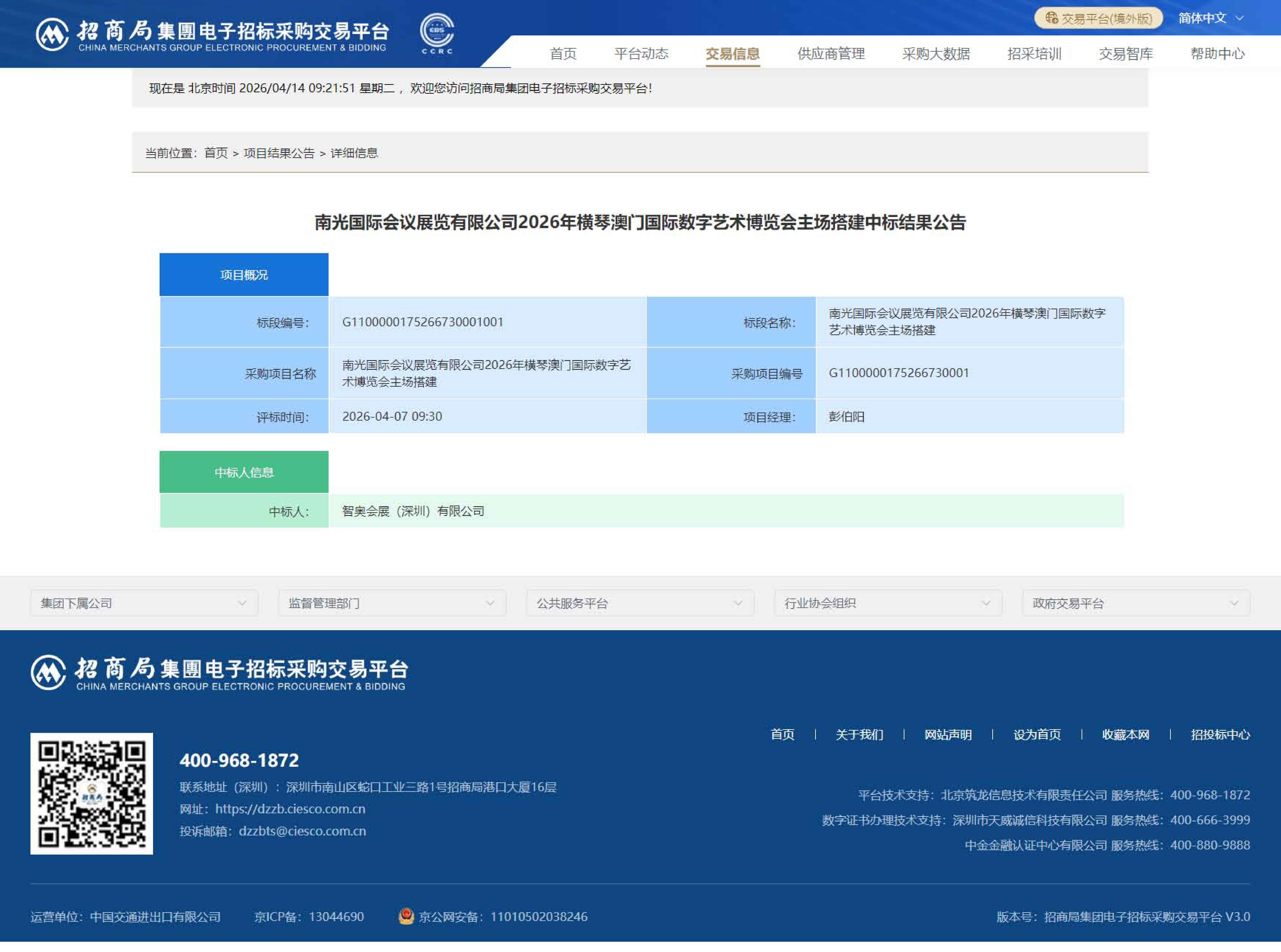 南光国际会议展览有限公司2026年横琴澳门国际数字艺术博览会主场搭建中标结果公告
